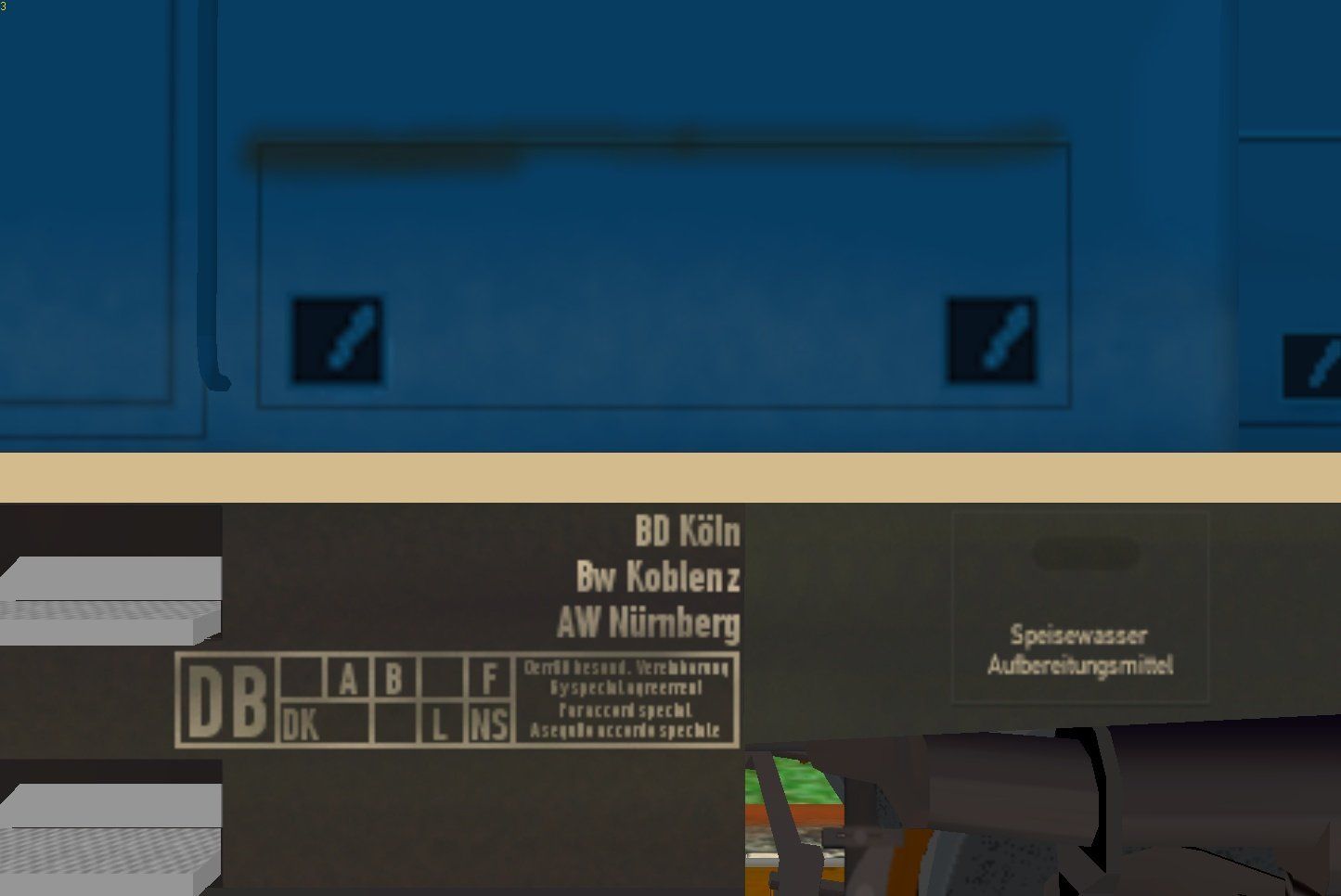 What sounds like a contradiction is not one here. The V 100 contained in the GR DB DBAG V 100 Austausch and GR DBAG V 100 Ergänzung packages have textures that represent the locomotives in different degrees of weathering. On closer inspection, however, it is noticeable that in some places the weathering does not look realistic or is faulty. This means that the weathering shown looks unnatural, or at the places where textures are adjacent, these transitions can be clearly seen, which also does not look realistic. What is meant by this can be seen in the following example images.