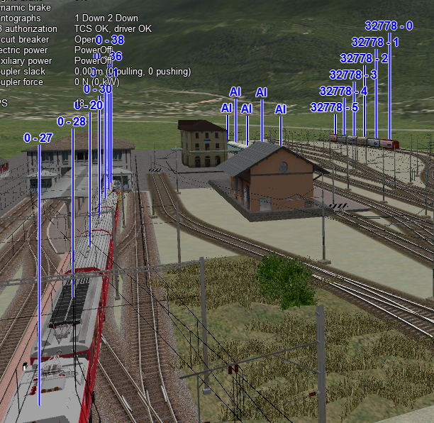 • Trasse: Der Zustand der Zugtrasse. Die Zahl links vom „=“-Zeichen ist der aktuelle Teilstreckenzähler des Zuges: Die Trasse eines Zuges wird in Teilstrecken aufgeteilt, wenn seine Strecke Umkehrpunkte enthält. Die Details zwischen { und } sind der eigentliche Unterpfad. Nach dem letzten } kann x<N> stehen. Dies zeigt an, dass der Zug am Ende dieses Unterwegs zum Unterweg mit der Nummer N weiterfahren wird. Pfaddetails: