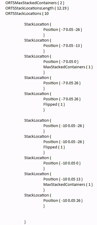 • IsGondola gibt an (falls auf 1 gesetzt), ob die Ladung beim Entladen gedreht werden muss, wie es bei einem Gondelwagen der Fall ist. Wenn er nicht vorhanden ist, wird der Parameter auf 0 gesetzt.
