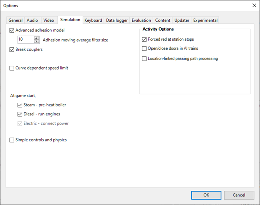 When this option is checked, stationary diesel locos start the simulation with their engines running. Uncheck this option for a more detailed behaviour in which the player has to start the loco’s engine.