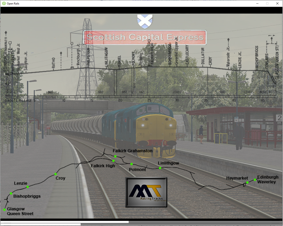 Sobald Sie Start gedrückt haben, lädt Open Rails alle zum Ausführen des Spiels erforderlichen Daten und verarbeitet sie. Während dieser Phase wird der Begrüßungsbildschirm der Route mit einer Anzeigeleiste unten angezeigt.