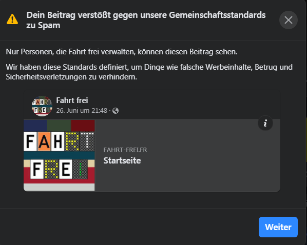 In the course of the last few months we have seen a lot in terms of censorship on Facebook, but that should certainly be new. In the last six months I have drawn attention to my own page fahrt-frei.fr several times on my Fahrtfrei.fr page on Facebook. On June 26th I then received the message shown below from Facebook.