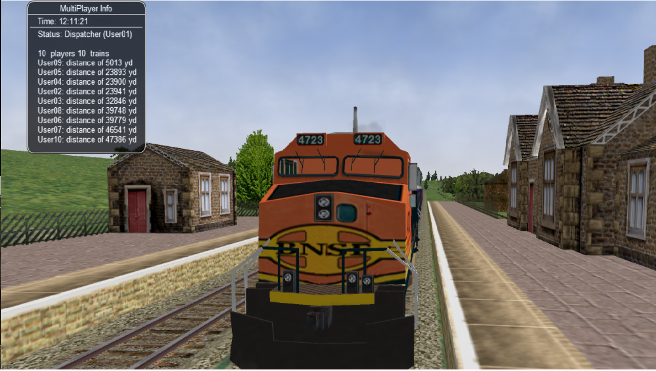 Once the dispatcher and clients have started and connected, to display the MultiPlayer status, you must press <Shift+9> to display the MultiPlayer Info window, at the bottom of it you will see the information. You can watch how many players and trains are present and how far away you are from others. You can also look if you are acting as dispatcher or as client and the username of each one.